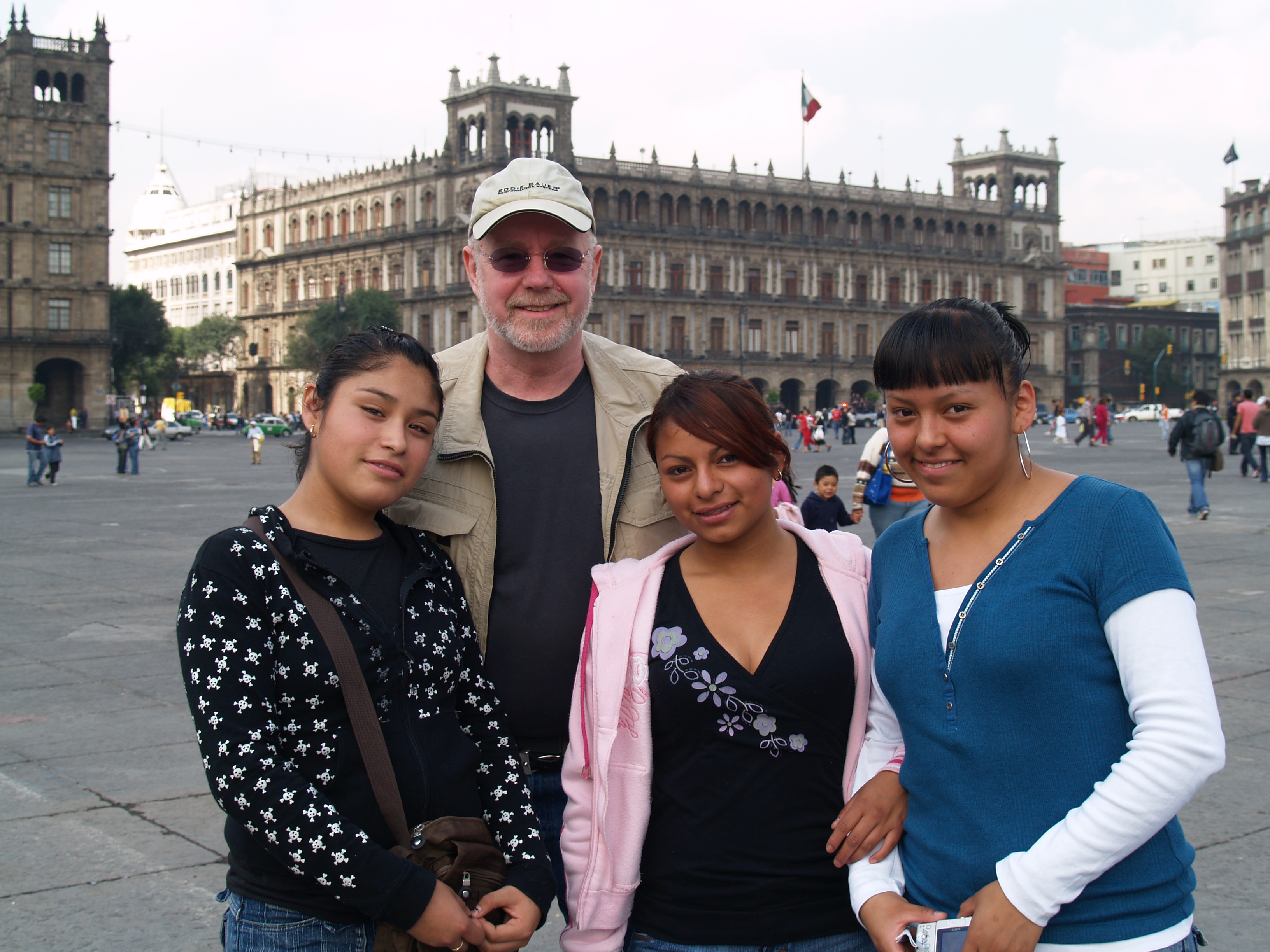 Jackie and I were strolling through the Zocalo in Mexico City one summer morning in 2008. We were in front of the Catedral Metropolitana, when three teenage girls came up to us and asked if we would speak English with them as part of a school assignment. (I can hear it now: find two Gringo tourists in the square and practice your English with them). How apropos. They each had a little script and asked us questions: “What is your favorite food?” “What kind of music do you like?” and so on. They recorded our responses. I tried a little of my Spanish with them, but they just giggled. Very sweet girls. Jackie took a picture of us.