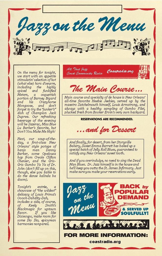 On the menu for tonight, we start with an appetite stimulatin’ selection of hot (what else) hors d’oeuvre, including the highly spiced and funkified Meters, a coquettish portion of Barney Bigard and his Crazyhorse Mongoose, and don’t forget to try the “junker’s” dish of Champion Jack Dupree. Our refreshing beverage of the evening will be Sazerac, Miss Blue Lu Barker’s favorite, but Don’t You Make Me High!