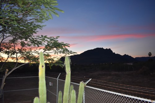 View of the electric El Jíto’s electric fence at nightfall with mountains north of Los Mochis in background. Site was actually perfect for an overnighter.