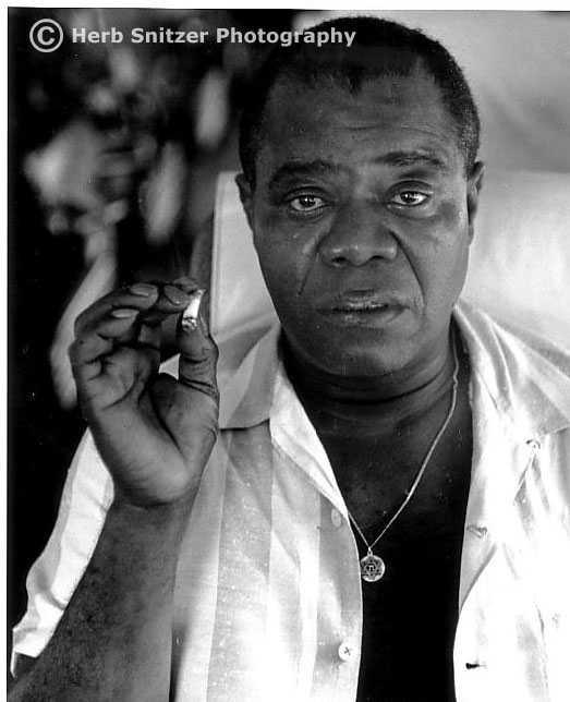 This is one of the most unusual photographs of Pops I’ve ever seen. Taken in 1960, Pop’s looks beat in this pic: With cigarette in hand, wearing his Star of David around his neck, the blown upper lip, Snitzer has captured him with a distant, far-away looking expression on his face. It’s neither a sad nor a painful looking expression—he’s just somewhere else at that moment. The Star of David he’s wearing around his neck is a gesture of respect for the Karnofskys, the New Orleans Jewish family who showed Louis so much kindness and who helped raise him.