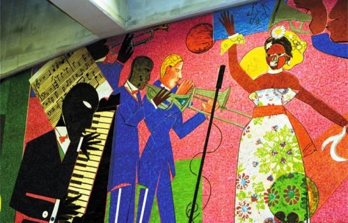 Romare Bearden’s mosaic Baltimore Uproar, 1983, located in the Upton / Avenue Market Metro Station, Baltimore, MD, depicts a jazz combo fronted by a singer who resembles Baltimore’s own Billie Holiday. (Credit: Baltimore Heritage)