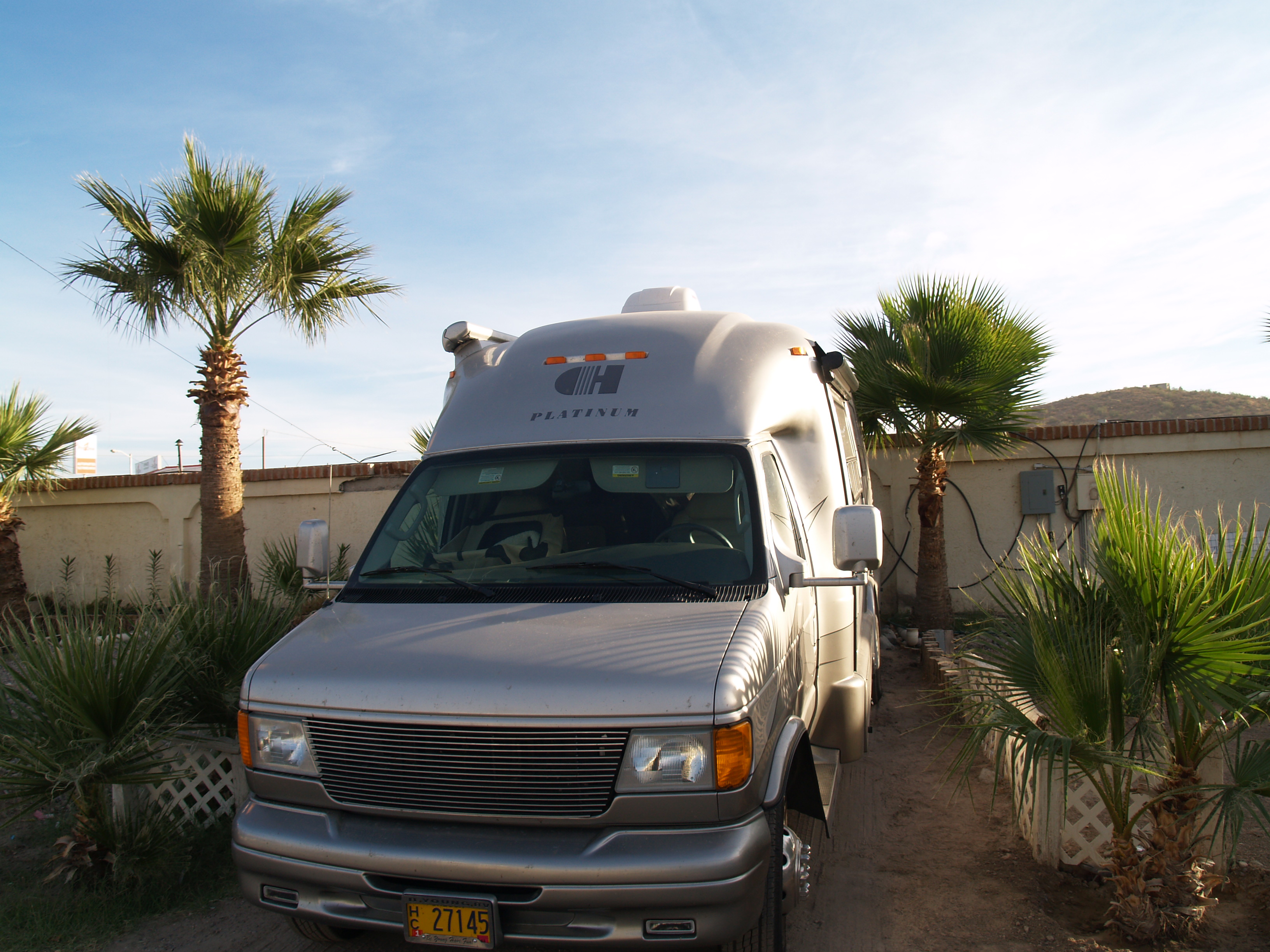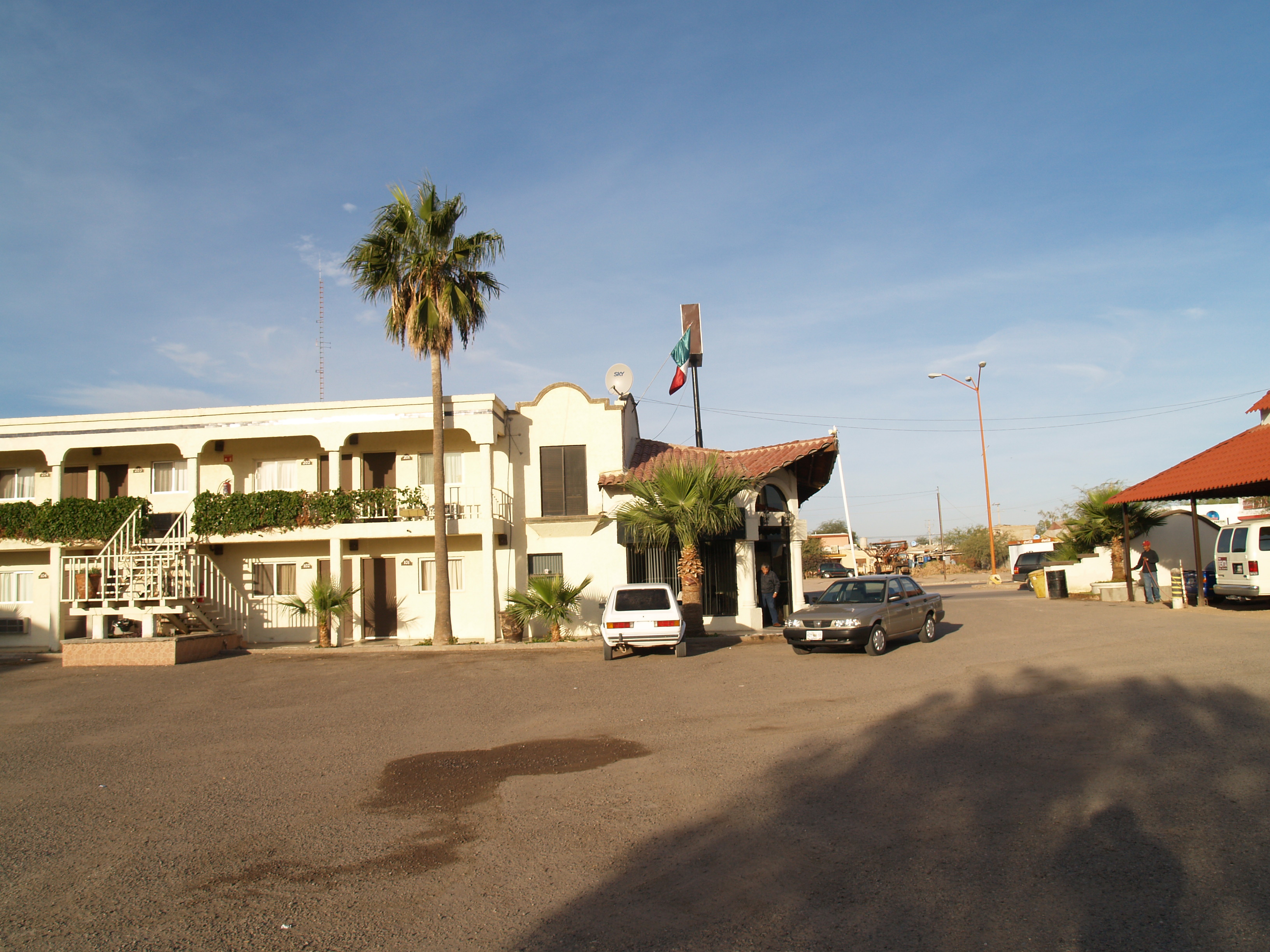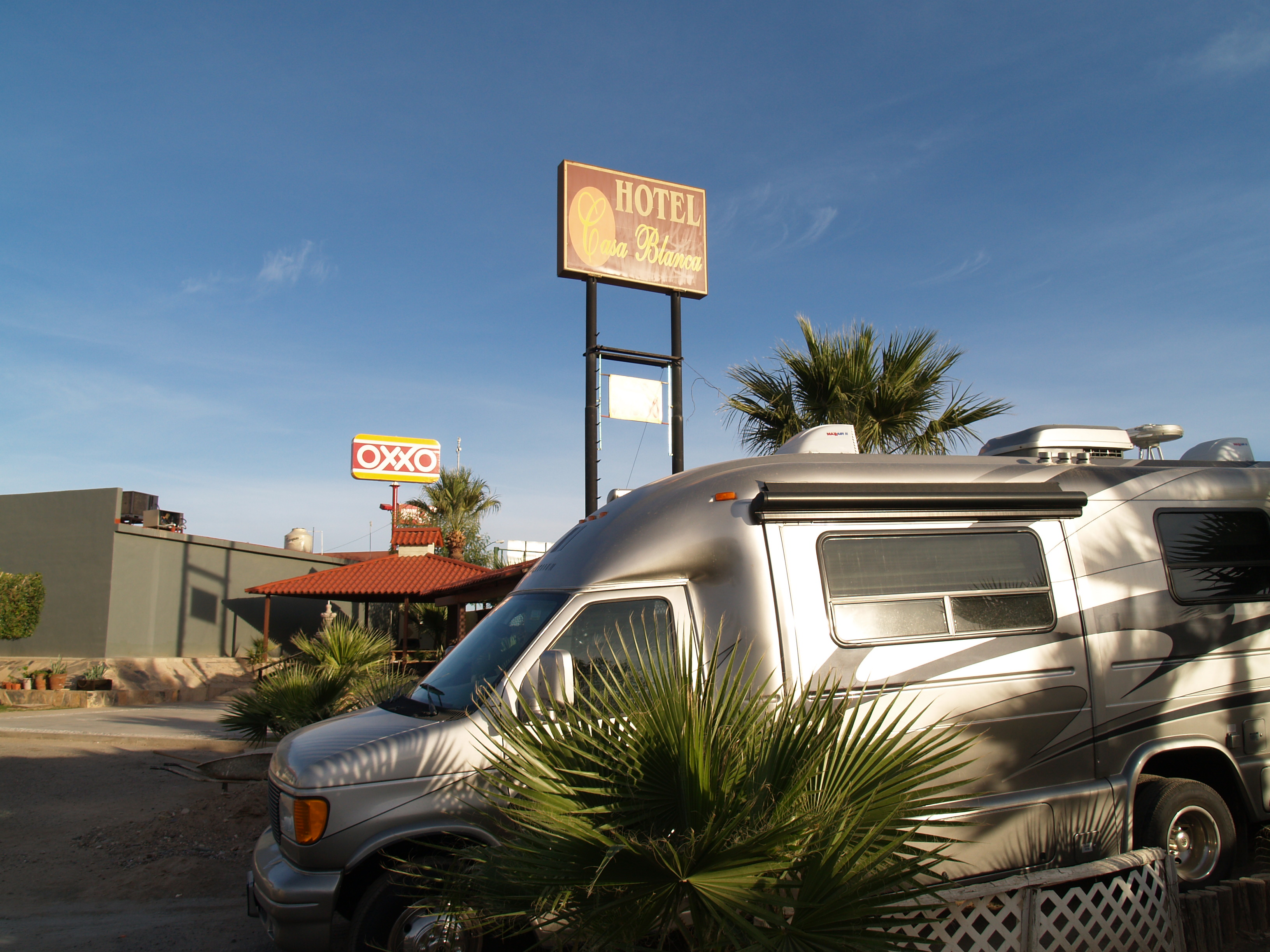 After driving around for almost an hour looking for the place, by sheer providence I spotted the hotel’s name atop a giant pole: Hotel Casa Blanca! Pulled in to their parking lot of the street and just opposite of the office, there were five tight little rv spaces of which only three seemed to be usable. The very friendly office lady pointed us to the only spot that had utilities. Tired, hungry, and very thirsty, we lay in for the night. No pesos meant no cervaza at least for that night.