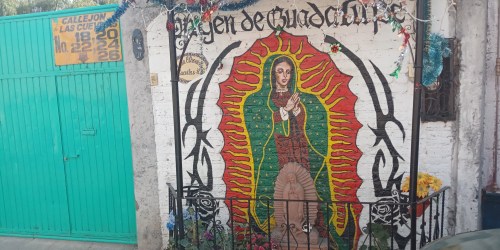 The ubiquitous image of the Virgin Mary is symbolically powerful to all who seek her protection and comfort.  And no matter where you go in Mexico, her image is everywhere—the small image painted on a door, the statue nestled into an alcove built into the outside wall of a house, massive murals spray painted on the sides of buildings, and tattoos of all shapes, sizes, and locations.