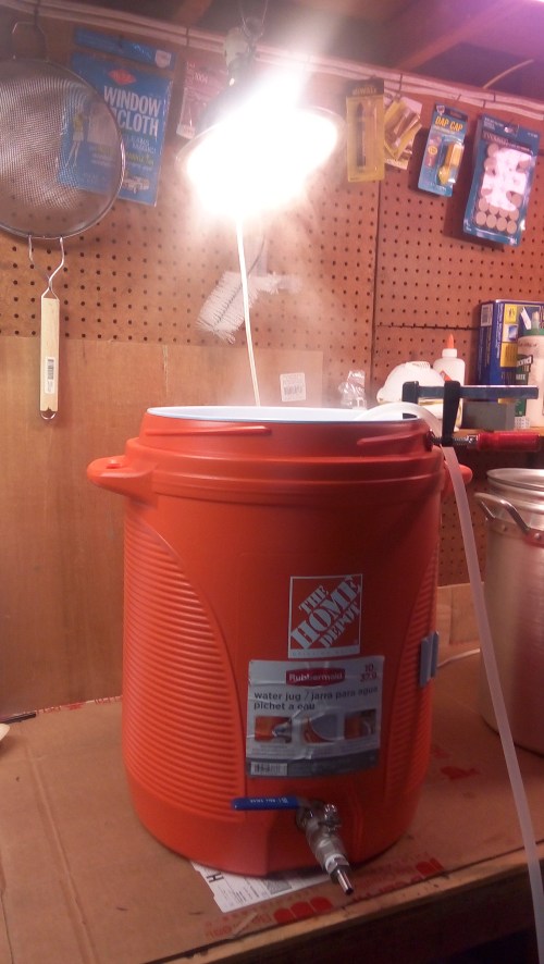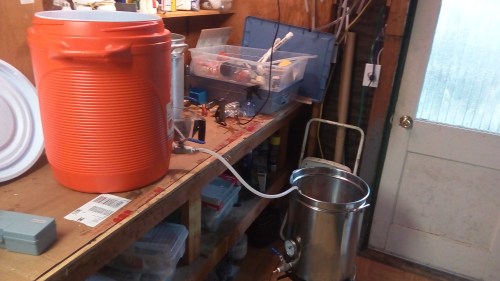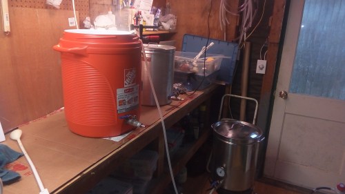 It’s been over a year since my last brew session. I brewed a Belgian wheat style beer using my new brewery set up that includes a small 12 volt hot water pump I modified to work on 120 volts. Some pics:
