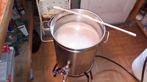 Starting the boil of about 7.5 gallons of wort which will boil down to about 6.5 gallons of sweet wort. Propane burner worked perfectly. Far more efficient use of BTU’s with propane than with natural gas on kitchen stove: