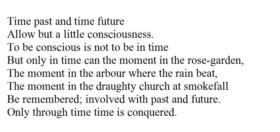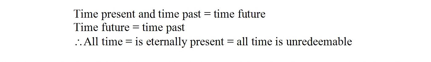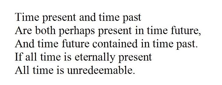 Time present I recognize the misapprehension we have of time. We lack either the willingness or the spiritual strength to understand  any but the narrow definitions of time. By this I mean time is ether past or future—what has happened or what will happen. But what if we at least acknowledge the possibility that time is an illusion? My amateurish attempt describes Eliot’s syllogism is as follows: