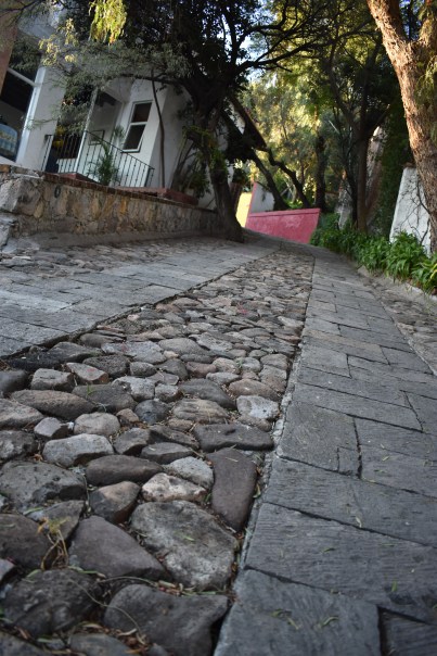 A better view of the driveway looking down toward the brown, steel inner gate. Note tree growing out of the cobble stones. Mexicans have a real reluctance to cut trees down, even if they pose a slight hazard as this one does for the unalert driver.  You see this everywhere in Mexico.