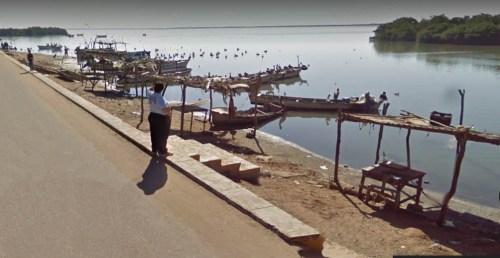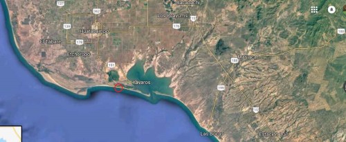 Pangas beached and floating in Yavaros Bay with cleaning tables in the foreground. Entrance to the port in the background. Source: Google Maps