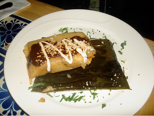 ie was immediately charmed by the waiter/chef and we stayed. We went for Oaxacan style tamales. These are not your common Mexican style tamales; these are made of mole negro (we learned, in fact, that there are three kinds of mole: negro, rich, dark; amarillo, more red than yellow, sweet, spicy, rich; and verde, subtle, full of flavor and white beans. I, unfortunately, have not had that many authentic tamales, but Jackie noted right away that these were different: the dough is thin and spread over a banana leaf. In the center, chopped chicken is drowned in a spoonful of superb black mole and served atop of opened banana leaf. We promptly tasted this magnificent culinary masterpiece. Says Jackie, “These are truly the most marvelous tamales I have eaten in my life.”